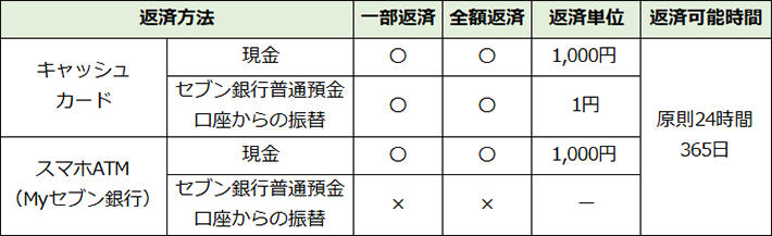※スマホATM(Myセブン銀行)から返済を行う場合は、現金によるご返済のみとなり、セブン銀行口座(普通預金)から振替によるご返済はできません。(一部返済か、全額返済かの選択のみ可能です。)