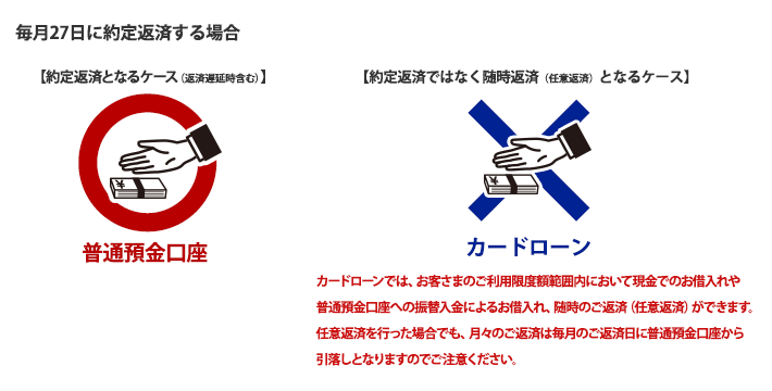月々のご返済は、毎月27日(土・日・祝日の場合は翌営業日)に普通預金口座からご返済金額を引落しいたします。