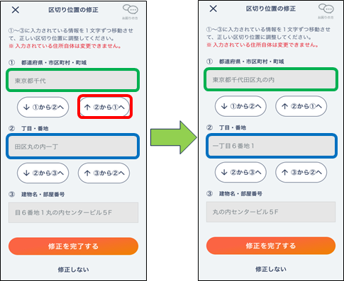 「修正を完了する」を押下し、画面に表示される住所の区切り位置が正しい位置になっていることをご確認ください。